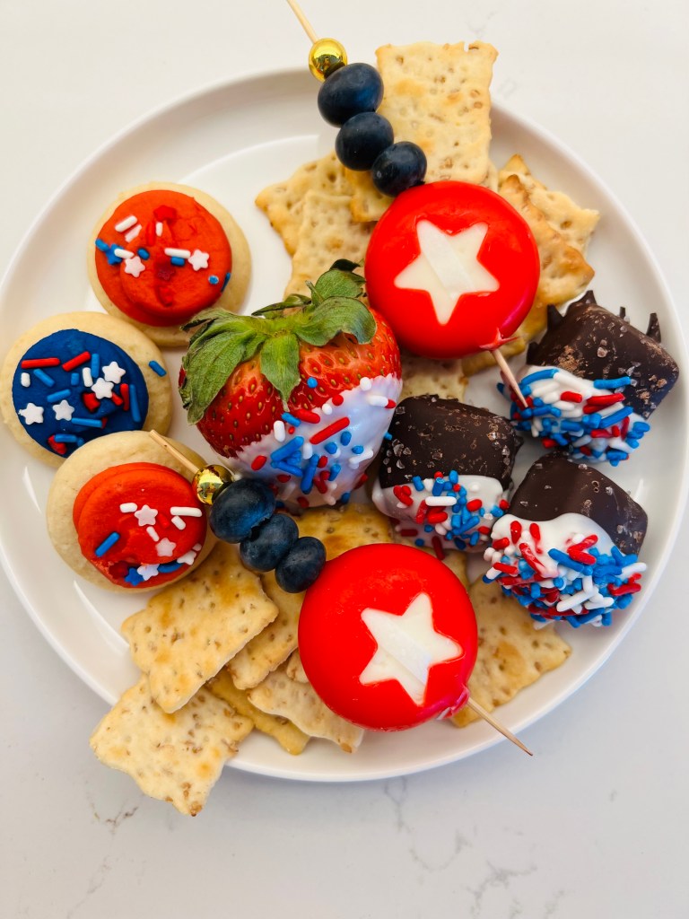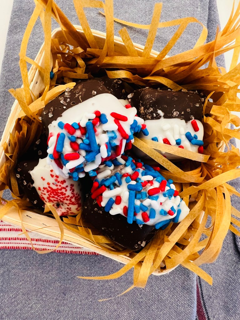 Tip Three: Anything dipped is a fan favorite. Dipping strawberries, cookies, chocolates or really anything and then adding a themed sprinkle on top will always elevate your table scape. So lets chat for a second about melting chocolates or any candy melt. The melting instructions will always say you can use the microwave but I have tried and failed enough to know that BEST way to melt chocolate is in a glass heat safe bowl and then place over a pot of bowling water. Once the water comes to a boil I allow for about half of the candy to melt. Then I turn off the heat and just allow the steam and heated candy to melt the rest. I stir continually until all the candy is melted and then dip right from there so it stays hot. I use wax paper to set the items on and pour the sprinkles on. Let them set for a bit. Chocolate takes longer to set than the candy melts so give yourself ample time. These would be easy to prep the day before and a GREAT way to get the kids involved too. I placed my little Sanders Candy chocolates in Ghirardelli chocolate and did red, white and blue sprinkles. For my table scape I placed these in little baskets that people can share or grab for themselves.