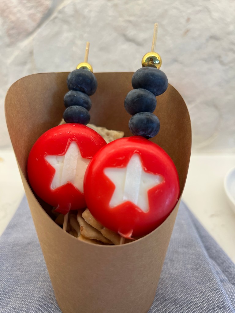 Tip Two: This is still a pre-prep idea but instead of having it all together, you can create small grab and go appetizer cups. Above I used these brown paper cups and they are perfect, pretty and neutral that you can use them for any theme or event. On Christmas Eve I dished out salad with a fork pre-prepped in them. Above I did a light charcuterie idea with Town House Crackers poured in the bottom, Babybel cheese with a star cut out of the wax, and 2 or 3 blueberries skewered on these pretty toothpicks with the cheese round. I mean how adorable did these turn out? The star cookie cutter I ordered off of amazon and I can wait to use it again in the fall to make the kid’s lunches a bit more fun.